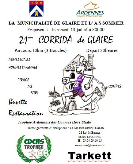 SAMEDI 13 JUILLET 2019 : 21éme CORRIDA DE GLAIRE 10KM EN 3 BOUCLES SANS AUCUNE DIFFICULTE . PRIME EGALE HOMMES ET FEMMES ; NOMBREUX LOT AU TIRAGE AU SORT ; BUVETTE ET PETITE RESTAURATION SUR PLACE .